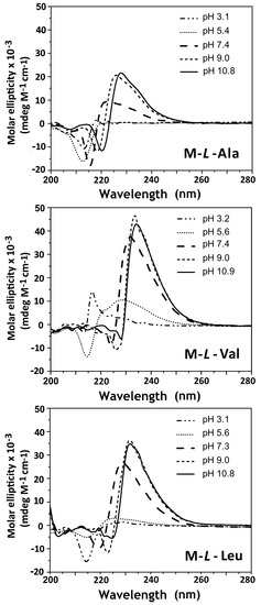 Plotting between pH 3 and 11 the differential molar ellipticity calculated taking as reference the values at pH 3, sigmoidal curves are obtained presenting for M-l-Ala, M-l-Val and M-l-Leu, respectively, a lower plateau in the pH intervals 3.0–5.5, 3.0–4.8 and 3.0–5.0; an inflection point at pH 8.1, 6.8 and 7.3; and an upper plateau at pH ≥ 10.4, pH ≥ 9 and pH ≥ 9.9 (Figure 4). The speciation diagrams (Figure 2) explain these results. The strongly acidic carboxyl groups are highly de-protonated, hence negatively charged from pH 4 upwards. The weakly basic tert-amine groups are highly protonated, hence positively charged, in the first plateau region but nearly completely de-protonated in the upper plateau region. For each PAAC, the sigmoid inflection point corresponds to the half-deprotonation of its amine groups, that is, occurs at pH = pKa2 (see Table 1). Apparently, the protonation degree of the chain amine groups as a function of pH is the main factor governing structuring and, consequently, the shape of the CD spectrum of PAACs in water.