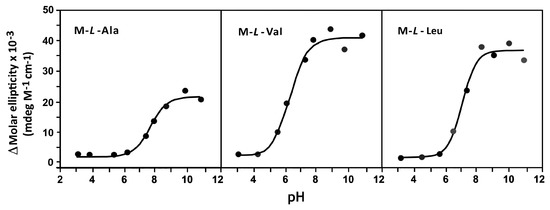pH Dependence of M-l-Ala, M-l-Val and M-l-Leu differential molar ellipticity at 228, 234 and 231 nm, respectively. Operational conditions: 1.83 ± 0.17 mM repeating units in 0.1 M NaCl solution. Based on data points reported in Figure S5.