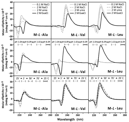 The spectra of all PAAC samples are only modestly affected by ionic strength (0.1 M and 2 M sodium chloride) and, for M-l-Val and M-l-Leu, by 2 M urea (Figure 5). The CD spectra reveal that for M-l-Ala, M-l-Val and M-l-Leu structuring, once formed at a given pH, is quickly and reversibly modified by pH changes (Figure 5). The same holds true for temperature in the interval 3–70 °C, to a far lesser degree for M-l-Val and M-l-Leu, but not for M-l-Ala, in whose CD spectrum at 70 °C the negative ellipticity nearly vanishes (Figure 5). It may be reminded that also the CD spectra of the first chiral members of the family, d- and l-ARGO7, showed the same resistance to temperature, ionic strength and urea [24]. However, they were also nearly insensitive to 2 M guanidinium chloride, possibly due to the presence of a guanidine pendant in their repeat unit, whereas the spectra of M-l-Ala, M-l-Val and M-l-Leu are not. In the presence of guanidinium chloride, in the M-l-Ala spectrum both positive and negative peaks are shifted toward higher wavelengths and their absolute intensities reduced. The same occurs for M-l-Val and M-l-Leu, but to a lesser extent.