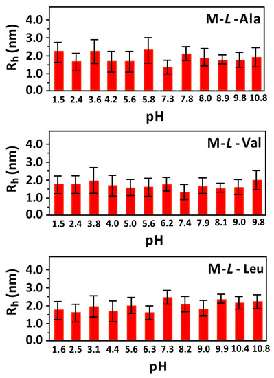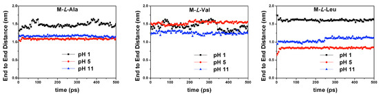 Adopting a simulation protocol used in previous work [31,32,33,34], molecular dynamics (MD) simulations at room temperature and final energy minimizations using molecular mechanics (MM) methods were carried out for M-l-Ala, M-l-Val, M-l-Leu with ten repeat units (see Scheme 1) bearing a positive (L+), a null (L0) and a negative (L−) charge per repeat unit (see Figure 2 and Table 2), using the same strategy used in the previous theoretical study for the PAAC from l-arginine, l-ARGO7 [24]. More details about the adopted software and force field, and about the simulation protocol are reported in the Supplementary Materials. In particular, starting from a fully elongated chain, at first the conformational properties of PAACs in an effective dielectric medium were investigated, and then more extensive simulation runs in the explicit presence of water molecules adopting a periodic simulation box were carried out. In the presence of water, after a preliminary molecule energy minimization in the chosen environment, the MD runs were performed at room temperature with final geometry optimization after achieving equilibrium. In both simulation environments a similar conformational behavior of the polymer chains was found, never displaying the typical polyelectrolyte extended conformations, in keeping with what already found for l-ARGO7 [24]. Some MD runs were also carried out for M-l-Ala at pH 1 using a different strategy starting again from a fully elongated chain in the effective dielectric medium. Briefly, MD runs were first performed at 500 K, then the temperature was decreased to 400 K and eventually to 300 K to check for possible trapping in a metastable state and to test for the robustness of the final conformation. No significant differences to within 4% were found for the calculated size descriptors reported below (Figure S6). For a meaningful comparison with the experimental results, the following discussion will be limited to the simulations carried out in explicit water.