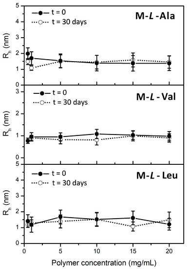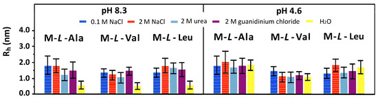 The PAAC hydrodynamic radii, Rh, obtained in 1 mg mL−1 solutions in aqueous 0.1 M NaCl by DLS measurements did not significantly vary within a wide pH range (1.5–11) notwithstanding their amphoteric nature (Figure 6). The particle size was stable at least up to one month suggesting that their compact structure could be ascribed to intramolecular interactions. The effect of ionic strength and denaturating agents was investigated (Figure 7). Both factors did not significantly affect Rh both at acidic and basic pH’s, apart from pH 8.3 water, where the dimensions of all PAACs were significantly lower, probably because in water additional intramolecular interactions existed, which were loosened in the presence of salts or denaturating agents.