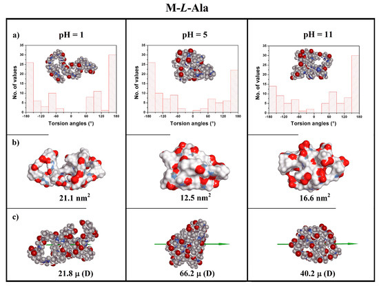 Finally, the pH dependence of the overall dipole moment μ (Table 2) is consistent with the pH dependence of the CD spectra (Figure 3). As previously found for l-ARGO7, for PAACs μ was lowest at pH 1, where all units were positively charged (Figure 2) and many local dipole vectors pointing to opposite directions mutually compensate. Furthermore, for M-l-Ala and M-l-Leu the dipole moment was highest at pH 5, where charges were electrically balanced. It moderately decreased at pH 11, where most units were negatively charged, and the local dipoles largely depended on the carboxylate groups (Figure 10, Figure 11 and Figure 12). Conversely, for M-l-Val the dipole moment was highest at pH 11 with a negatively charged repeat unit due to a combination of charged groups and local dipoles associated with the chemical bonds.