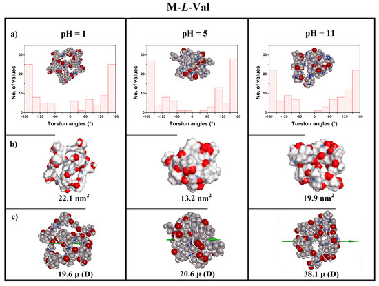 (a) Main chain molecular conformations in water at the end of the MD runs for M-l-Val at pH 1, 5 and 11 and torsion angle distributions around the main chain bonds: the histogram are shown with a binning of 30°. Color codes: C atoms dark grey; H atoms light gray; N atoms blue; O atoms red. (b) Solvent accessible surface area in water. The surface area is in dark grey near C atoms, in light gray near H atoms, in blue near N atoms and in red near O atoms. (c) Dipole moments in water. Color codes are the same as in row (a).