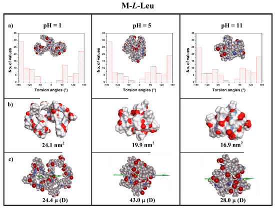 (a) Main chain molecular conformations in water at the end of the MD runs for M-l-Leu at pH 1, 5 and 11 and torsion angle distributions around the main chain bonds: the histogram are shown with a binning of 30°. Color codes: C atoms dark grey; H atoms light gray; N atoms blue; O atoms red. (b) Solvent accessible surface area in water. The surface area is in dark grey near C atoms, in light gray near H atoms, in blue near N atoms and in red near O atoms. (c) Dipole moments in water. Color codes are the same as in row (a).
