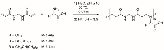 Recently, another family of α-amino acid-derived polymers, called polyamidoamino acids (PAACs), has materialized [23,24]. PAACs are prepared by Michael-type stepwise polyaddition of α-amino acids with N,N′-methylenebisacrylamide (MBA) in the same way as linear polyamidoamines (PAAs) [25]. The polymerization involves only the amino acid prim-amine group, which is transformed into a tert-amine group maintaining its basic properties. The amino acid carboxyl group is not involved. Therefore, PAACs are still endowed of the amphoteric properties peculiar of parent α-amino acids.