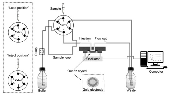 Bruker 500 MHz Spectrometer (BrukerDaltonics Inc., Billerica, MA, USA) recorded 1H NMR spectra, using residual signals from D2O (1H: δ 4.79 ppm) or CDCl3 (1H: δ 7.26 ppm) as internal standards. Chemical composition of the sensor surface was determined by an X-ray photoelectron spectroscopy (XPS) instrument (Thermo Fisher Scientific Inc., Waltham, MA, USA). The Attana Cell A200 QCM (Attana AB, Stockholm, Sweden) under a continuous flow mode was used to carry out the interaction measurements (Figure 1) [15]. Attana gold sensor chips (Attana, Stockholm, Sweden), with 8 mm in diameter and a 4.5-mm diameter gold electrode on each side, were used for further modification to produce the carbohydrate sensor chips.