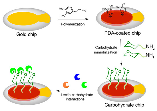 50 μL carbohydrate solution (100 mg/mL in PBS, pH 7.4) was applied to the chip surface coated by PDA, then incubated for 4 h at room temperature. After incubation with the carbohydrate solution, the sensor chip surface was further rinsed with PBS in order to remove the carbohydrate which was un-immobilized on the surface.