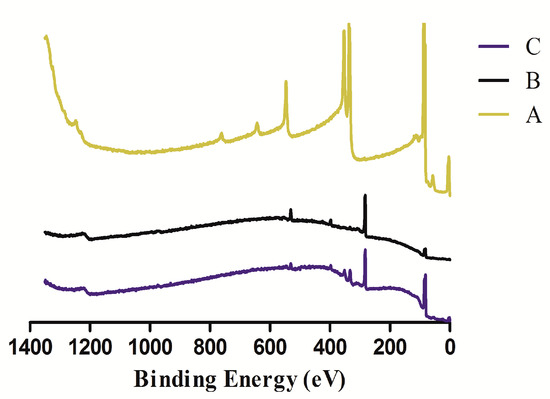 XPS spectra of different chip surfaces: unmodified gold chip surface (A), PDA-coated chip surface (B), and Compound 6-immobilized chip surface (C).