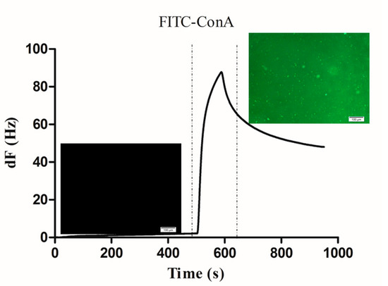 When a stable baseline was achieved (frequency shift < 0.2 Hz/min), in order to block the PDA areas which was not modified with carbohydrate, bovine serum albumin (BSA) was repeatedly injected over the carbohydrate chip surface until the surface was saturated and no more binding could be detected. In order to prove the interaction between lectin and carbohydrate by fluorescence imaging, FITC-Con A with green fluorescence was used for the interaction study. After the injection of the BSA, FITC-Con A (50 μg/mL) was subsequently injected onto the sensor chip surface. As shown in Figure 4, the binding response of the injection of FITC-Con A was recorded, resulting in a frequency shift about 50 Hz. Before and after the injection of the FITC-Con A, a fluorescence microscopic evaluation was performed. Before injection, only a black field was observed, while green fluorescence could be observed after injection of FITC-Con A onto the carbohydrate chip surface. These different results confirmed that the frequency shift monitored by QCM specifically reflected the surface interactions between FITC-Con A and the carbohydrate which was immobilized on the PDA-coated surface.