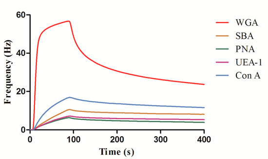 Firstly, the carbohydrate sensor chip was inserted to QCM, and then equilibrated under PBS running buffer at a flowrate of 25 μL/min. In order to minimize nonspecific binding, BSA solution was used to block the surfaces with several injections before the injection of lectins. When a stable baseline was achieved (frequency drift < 0.2 Hz/min), BSA (50 μg/mL) was injected to the carbohydrate chip surface. Then, an injection consisting of 50 μg/mL lectin (WGA, SBA, PNA, UEA-I, Con A) was performed in order to assess the interactions between the immobilized carbohydrate and the different lectins. Following each lectin injection, 10 mM glycine at pH 1.5 was injected to the surface to remove the interacting lectin. The processes of interaction and regeneration between lectin and carbohydrate were monitored using the Attester software. Figure 5 shows five different lectins (WGA, SBA, PNA, UEA-I, Con A) binding to GlcNAc-functionalized sensor chip surface. From the different lectin binding results, it can be noted that WGA proved to be the highest binding with more than 30 Hz based on binding specificity, small amounts of potential nonspecific lectin bindings were detected, hypothetically owing to nonspecific binding between unblocked PDA-coated carbohydrate sensor chip surface and lectins.