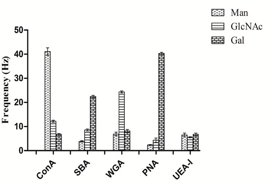 The five different lectins (WGA, SBA, PNA, UEA-I, Con A) binding to Man- and Gal-functionalized chip surfaces were also studied, respectively. The binding results between the different lectins and the three carbohydrate sensor chip surfaces were represented in Figure 6. From the binding analysis, Man-functionalized sensor chip surface displayed binding specificity to Con A, Gal-functionalized sensor chip surface displayed binding specificity to PNA. Comparison of the results in sensitivity among the three kinds of carbohydrate sensor chip surfaces shows that the surfaces had a specificity binding to different lectins, which is consistent with traditional ELLA test results [42]. Furthermore, the previous study of the interaction between the above-mentioned carbohydrates and lectins based on carbohydrate chips by other biosensors demonstrated the same specificity binding results [20,43,44].