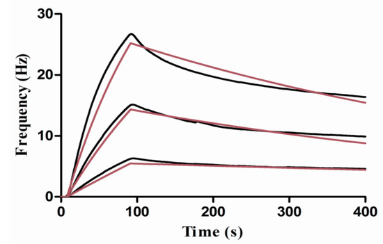 Kinetic evaluation of Con A and mannose interaction. The Con A at 20, 10, 5 μg/mL was injected over the sensor surface, respectively, and the measured responses were recorded as black lines, the theoretical 1:1 fits using the ClampXP software (Attana) were shown in red lines.