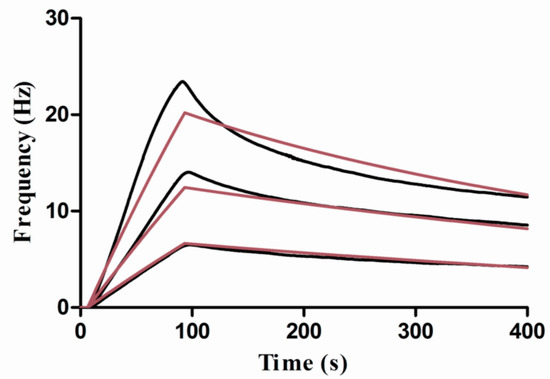 PDA-coated carbohydrate sensor surface was utilized to study the interaction kinetics between lectins and the immobilized carbohydrate. To study the interaction kinetic properties between Con A and mannose, a dilute solution of Con A in the running buffer was injected to the surface. The concentrations were 20, 10, and 5 μg/mL. The interaction between lectin and carbohydrate was monitored for 85 s association while for 300 s dissociation. After each cycle, 0.1 M glycine (pH 1.5) was injected for regeneration of the surface which enable remove the interacting lectin. Figure 7 shows the resulted binding responses. Using the ClampXP software, the global fit with the theoretical 1:1 interaction model was performed, giving the resultant association rate constant kon = 3.51 × 104 M−1·s−1, dissociation rate constant koff = 1.60 × 10−3 s−1, and equilibrium dissociation constant KD = 45.6 nM.