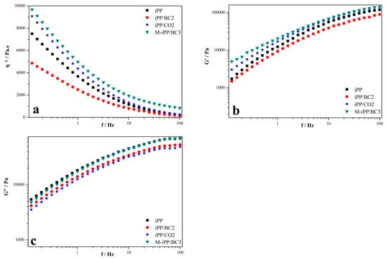 The rheological properties of iPP/BC composites were characterized in order to study the compatibility of iPP and BC. The complex viscosity of the iPP/BC composites is shown in Figure 1. It can be found that the complex viscosity of the composites reduce sharply in the range of high frequencies. This phenomenon reveals that the composites present evidence of shear-thinning behavior with increasing frequencies [29]. It can be found that the complex viscosity and storage modulus of the composites increase in the order of iPP/BC2, iPP, iPP/CO2, and M-iPP/BC3. Moreover, the addition of MAPP to iPP evidently increases the complex viscosity, especially at low frequencies, and this can be attributed to the formation of a two-phase structure. The existence of interfacial interactions between iPP and BC leads to the increase in the viscosity of the blend [32]. Usually, the energy storage mechanisms at the interphase of polymer and filler reflect the elastic properties of the composites. The relaxation of the BC is often longer than the relaxation of the iPP, which means the storage modulus of iPP/BC is lower than pure iPP [33].