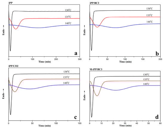 Figure 4. Isothermal crystallization kinetics curves of the iPP/BC composites. (a) iPP (b) iPP/BC2 (c) iPP/CO2 (d) M-iPP/BC3.