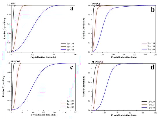 Figure 3. Relative degree of crystallinity with time of iPP/BC composites. (a) iPP (b) iPP/BC2 (c) iPP/CO2 (d) M-iPP/BC3