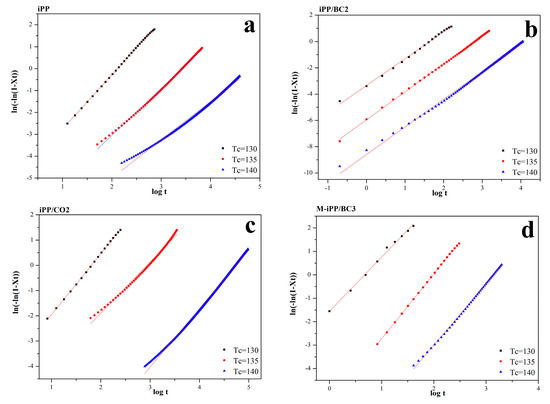 The classical Avrami equitation, which is given in Equation (1), is used to study the isothermal crystallization kinetics of iPP/BC composites [35,36].