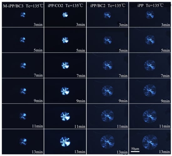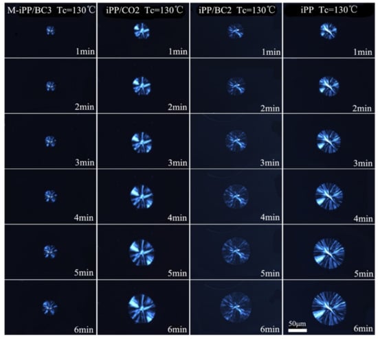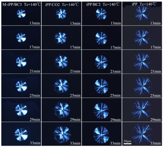 Besides, the diffusion and regular accumulation rate of the polymer chain segments have a great influence on the spherulite growth rate [41]. It can be found in Figure 8b, the spherulite growth rate of the iPP/BC composites decreases as the rule: iPP, iPP/BC2, iPP/CO2, and M-iPP/BC3 at the same isothermal crystallization temperature. This is because the regular accumulation rate of the iPP and BC is identical at the same isothermal crystallization temperature, and the effect of BC on the spherulite growth rate is mainly reflected in the diffusion velocity of the crystalline segments in the iPP melt. When the iPP crystal grows, BC hinders the diffusion of iPP chains toward the crystal growth direction, which leads the spherulite growth rate of iPP/BC composites to slower than that of pure iPP. From another point of view, the composites with BC will not produce large spherulites. In this case, the composites with excellent mechanical properties can be expected. In addition, this is evidence of the change in compatibility of the iPP/BC composites after the different modification.