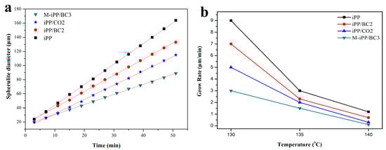 The related studies show that the growth rate of spherulites in most polymer blends is only related to the crystallization temperature, and some researchers believe that the growth rate of spherulites is nonlinear in non-isothermal condition [37,38]. In this paper, the POM images at 135 °C were taken as an example, the spherulite radial growth rate of the iPP/BC composites was calculated (Figure 8a). It can be found from Figure 8a that the diameter of spherulites presents a linear growth with the extension of crystallization time and the slope is the spherulite growth rate of iPP at this temperature. The spherulite growth rate at different isothermal crystallization temperatures can be obtained by the calculation of POM images at different temperatures (Figure 8b). It can be observed in Figure 8b that, with the decrease of crystallization temperature, the spherulite growth rate of the sample increase rapidly. This is because the crystallization rate of growth depends on the chains in the crystal diffusion and structured deposits. With the decrease of crystallization temperature, the melt viscosity increases, reducing the chain segment mobility, crystal diffusion rate of the chains decreases. At the same time, with the regular degree of isothermal crystallization temperature related accumulation rate increases. While the melt viscosity and degree of isothermal crystallization temperature are the influencing factors of spherulite growth rate of the polymer blends, the crystallization temperature of iPP is close to melting point, which is much higher than that of glass transition temperature. Therefore, the influence of crystallization temperature reduction on the degree of isothermal crystallization temperature is much higher than that on melt viscosity, which causes the spherulite growth rate to increase rapidly with the decrease of crystallization temperature in the experimental temperature range [39,40].
