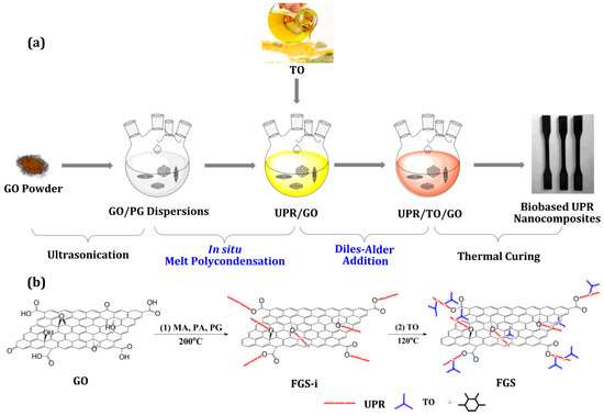 (a) The prepatration of graphene-reinforeced biobased unsaturated polyester nanocomposites via a combination of in situ melt polycondensation and Diels–Alder addition; (b) possible chemical changes of graphene oxide (GO) during the in situ preparation of biobased nanocomposites.