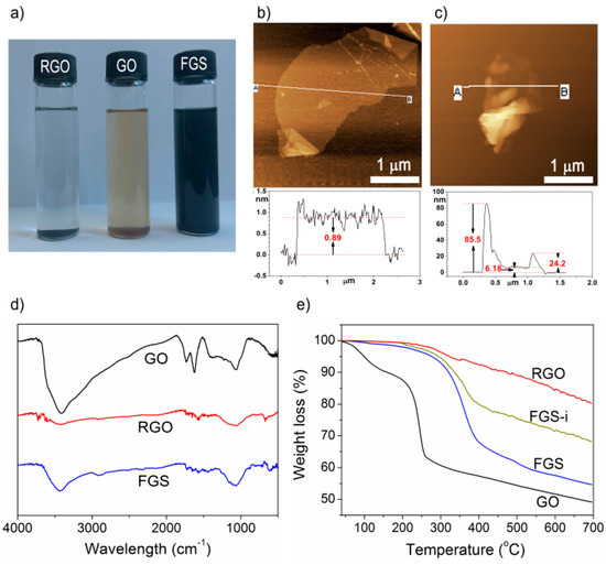 (a) Sedimentation experiment; (b,c) atomic force microscopy (AFM) images of GO and FGS; (d) FT-IR spectra of GO, thermally reduced GO (RGO), and FGS; (e) TGA curves of GO, RGO, FGS-i, and FGS.