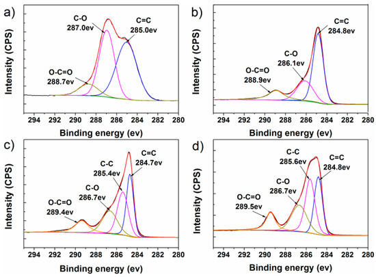 XPS was conducted to further analyze the graphene-based compounds, as shown in Figure 3a–d. In the spectra of GO, only three peaks were depicted: sp2 C=C (~285.0 eV), C–O (~287.0 eV), and O–C=O (~288.7 eV). The RGO spectra also comprised the three peaks, but the intensities of oxygen-containing peaks at 286.1 and 288.9 eV (relative to the C=C peak) decreased obviously. In both the spectra of FGS-i and FGS, the three peaks had a similar trend as those in RGO, indicating the reduction of GO. Differently, new peaks occurred at 285.4 or 285.6 eV, which means the ocurrence of sp3 C–C bonds [34,35,36,37]. The bonds probably came from the grafted polyesters and TO molecules which involved many sp3 C–C bonds. Compared to FGS-i, the intensity of new C–C peak in FGS spectra increased (relative to that of C=C peak) due to the incorporation of TO. The C/O atomic ratios for all the graphene nanomaterials, neat UPR, and TO were caculated and the related data are listed in Table 1. With the C/O ratios of UPR, RGO, and FGS-i, the weight content of grafted unsaturated polyesters onto graphene can be estimated and was about 28%; with the ratios of TO, FGS-i, and FGS, the grafted TO can also be determined and was around 5%. These values are close to the calculated values from the TGA results.