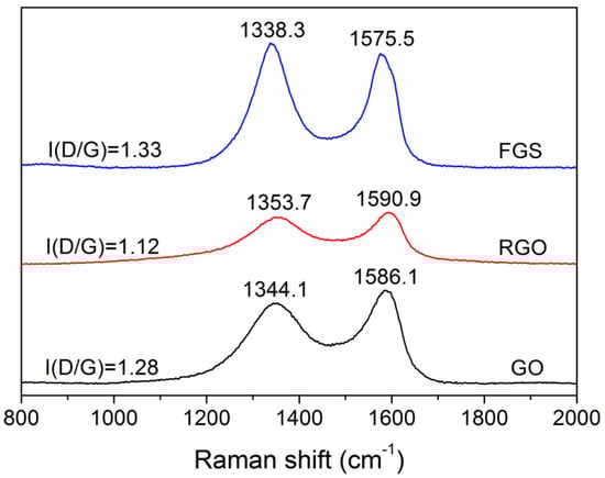 Raman spectroscopy has been reported as a powerful probe for the structures of carbonaceous materials. Figure 4 gives the Raman spectra of GO, RGO, and FGS. The GO spectrum displayed a D band at 1344.1 cm−1 and G band at 1586.1 cm−1 which are ascribed to the breathing mode of κ-point phonons of A1g symmetry and the first-order scattering of the the E2g phonons, respectively [33,34]. In the spectrum of RGO, the G band blue-shifted to 1590.9 cm−1, which was close to the value of raw graphite. In the spectrum of FGS, the D and G bands shifted to 1338.3 and 1575.5 cm−1. The red-shift of G band can be attributed to that the defects of FGS were more apparent than those of GO. The intensity ratio of D and G bands (I(D/G)), corresponding to the disordered and ordered crystal structures of carbon, is inverse to the average size of sp2 domains [33,34,36]. The I(D/G) value decreased from 1.28 for GO to 1.12 for RGO, which was in good agreement with the fact that RGO was reduced GO. In contrast, the value of FGS (1.33) was a little higher than that of GO. The reason for the slight increase may lie in that the grafted polymers make the defects of graphene more distinct than the orginal ones.