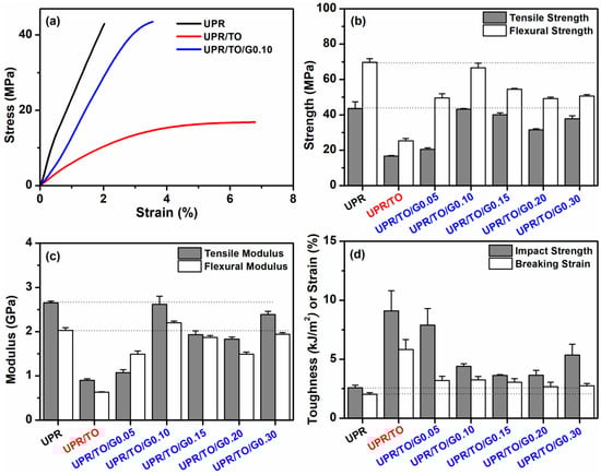(a) Stress–strain curves of neat UPR, UPR/TO, and UPR/TO/G0.10; (b) tensile and flexural strengths, (c) tensile and flexural moduli, and (d) impact strength and tensile breaking strain of UPR, UPR/TO, and UPR/TO/GO composites.