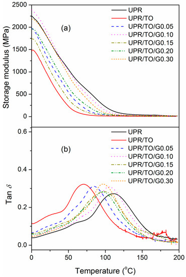 DMA was performed to study the thermo-mechanical properties of neat UPR, UPR/TO, and UPR/TO/GO composites, as shown in Figure 7. The related results are presented in Table 2. The storage modulus at 25 °C (E′25), which can also reflect the stiffness, was 1.67 GPa for neat UPR. By the incorporation of 10% TO, the data decreased to 0.83 GPa due to the phase separation. As the increase of GO content, the value also experienced a firstly-increasing and subsequently-decreasing process, and showed a rebound at 0.30% of GO. The optimal value occurred at 0.10% of GO and was 1.76 GPa, which was 5.39% and 112% higher than those of UPR and UPR/TO, respectively. Glass transition temperature (Tg) can be determined from the peaks of loss factors (tan δ). The variation of Tg demonstrated an analogous trend as E′25. The Tg of UPR/TO/G0.10 was 105.2 °C, which was only 4.88% lower than neat UPR’s (110.6°C) but 49.4% higher than that of UPR/TO (70.4 °C). The improvements of E′25 and Tg for UPR/TO/G0.10 are ascribed to the good exfoliation of FGS and the strong FGS–polymer interaction too.