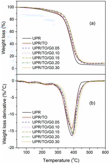 TGA was carried out to investigate thermal stability of neat UPR, UPR/TO, and UPR/TO/GO composites, as indicated in Figure 8. The thermal-property data, including 5% weight-loss temperature (T5), peak temperature at the curve of weight–loss rate (Tp), and char yield (wchar) are summarized in Table 2. All the properties possessed similar trends of variation as E′25 or Tg when the GO content increased. For the neat UPR they were 212.2 °C, 388.1 °C, and 5.70%, respectively. And for the UPR/TO/G0.10 composite they were 270.6 °C, 392.9°C, and 8.37%, which were 27.5%, 1.24%, and 46.8% larger than those of neat UPR, respectively. Therefore, the thermal stability of UPR/TO/G0.10 composite was apparently superior to that of neat UPR.