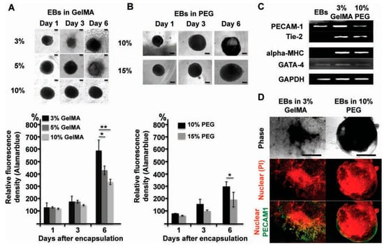 The effect of hydrogel properties on differentiation of EBs. (A,B) Phase contrast images of EBs. And cell proliferation was measured by using Alamarblue assay at same time point. (C) Expression of vasculogenic (PECAM1, Tie2) and cardiogenic (alpha-MHC and Gata4) in EBs after 6 days, and in EBs before encapsulation (left line). (D) Immunostaining PECAM1 (green) (scanning confocal microscopy) in EBs encapsulated in 3 wt % GelMA (left lane) and 10 wt % PEG (right lane) after 7 days culture with nuclear co-staining (PI, red) [40]. (Reproduced with permission from Qi H et al. Adv Mater; published by John Wiley and Sons, 2010).