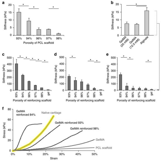 (a) Compressive moduli of PCL scaffolds; (b) hydrogels alone. GelMA reinforced with PCL scaffolds and crosslinked with either (c) 25 mM or (d) 12.5 mM APS/TEMED were one order of magnitude stiffer than the scaffolds or gel alone; (e) a comparable degree of reinforcement for reinforced alginate gels; (f) Stress–strain curves of GelMA, the PCL scaffold and reinforced GelMA, approaching the curve of native cartilage (yellow) [98]. (Reproduced with permission from Visser J et al. Nature Communications; published by Springer Nature, 2015).