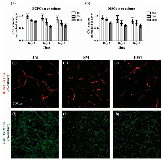 Co-culture of vascular cells in GelMA. Constructs containing both DsRed-ECFCs and CMFDA-labeled MSCs were cultured for 2, 4 and 6 d using GelMA hydrogels with different methacrylation degrees. (a,b) Numbers of DsRed-ECFCs (a) and CMFDA-MSCs (b) were separately counted at each time point under a fluorescence microscope. (c–h) Representative confocal microscopy images of DsRed-ECFCs (c–e) and CMFDA-MSCs (f–h) after day 6 in co-culture for each methacrylation degree. [28]. (Reproduced with permission from Chen Y-C et al. Advanced Functional Materials; published by John Wiley and Sons, 2012).