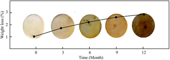 The weight loss and color change of the films exposed to the outdoor soil were plotted to evaluate the degradation of PA (Figure 1). It was clear that the was longer the exposure time in the soil, the darker was the color of the samples. The original color of PA was white and would remain so when exposed in water or air. The films lost 1.77% of their weight after 12 months, indicating continued degradation in the soil. During the degradation process, the color depth of the film may be interrelated to the weight loss, and the dark color of the film was resulted from the bond with soil.