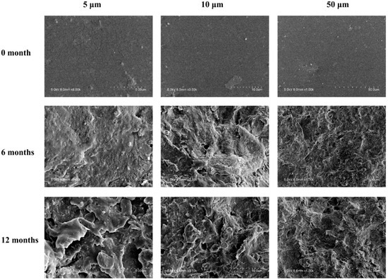 The surface morphologies of PA during burying in outdoor soil were investigated by SEM (shown in Figure 2). The surface of the original PA samples were smooth. After six months buried in soil, their surfaces became rough, and many cracks and holes formed. This was exacerbated after 12 months. This indicated that the PA films had been partially degraded at its surface layer in the soil. PA was reported to be biodegradable [8]. The white-rot fungus, Phanerochaete chrysosporium, has been found to biodegrade PA in the soil [10]. By the measurement of 13C-labeled PA, main-chain scission occurred primarily at the surface of the polymer when degraded in the soil, i.e., involving “loss ends” and/or oligomers [9].