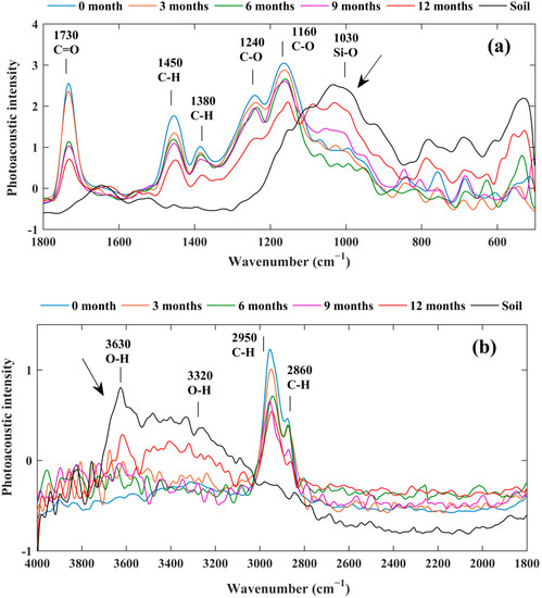 The chemical structure changes on the surface of the PA films were investigated by FTIR-PAS. Figure 3a,b shows the average spectra in the wavenumber range of 500–1800 and 1800–4000 cm−1, respectively. According to Equation (1), the thermal diffusion lengths were calculated (Table 1). On the one hand, the peak intensity of the molecular bonds about C–H (2950 cm−1), C=O (1730 cm−1), and C–O (1160 cm−1), were all on the same order of 0-month film > 3-month film > 6-month films > 9-month film > 12-month film, which indicated that being buried in the soil reduced the intensities of these molecular groups; as PA were mainly formed by these molecular groups, they were highly degraded in the soil. On the other hand, the O–H (3320 cm−1) and Si–O (1030 cm−1) groups, belonging to the soil, were clearly detected in PA samples after 9 and 12 months. It indicated that soil adhered to the surface of PA, and longer the samples were exposed, more the soil was adhered to PA. When the main-chain scission occurred at the surface and the cracks and holes formed, the surface density of the polymer decreased. Therefore, the molecular composition at the surface of the polymer decreased, and the C=O, C–H and C–O bands decreased. The surface layer of the polymer degraded, but the inside layer of the polymer did not degrade for 12 months. The degradation occurred from the outside layer to the inside layer. This was why the weight loss was small but the molecular bonds decreased relatively more.