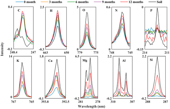 The atomic composition changes on the surface of the PA films were investigated by LIBS. Figure 4 shows the average LIBS spectra of PA films from 0 to 12 months and soil at the selected wavelength ranges from 200 to 1000 nm. The concentration of the nutrient elements, including N (646.5 nm), P (212.3 nm) and K (766.3 nm); the main compositional elements of PA, such as C (589.1 nm), H (656.3 nm) and O (757.5nm); and mineral elements, such as Ca (393.1 nm), Mg (279.4 nm), Al (309.1 nm, 308 nm), and Si (288.1 nm), all followed the order of: 12-month film > 9-month film > 6-month film > 3-month film > 0-month film. It was clear that the mineral and nutrient elements of the soil invaded in the films, and PA received more soil elements the longer they stayed in the soil. According to FTIR-PAS spectra, the PA organic compounds decreased, therefore the increased PA compositional elements were inorganic compounds. The concentrations of most PA films elements were less than soil-forming elements except C and H, because these are the main PA constituents. The adsorption of nutrient elements onto PA samples reduced the nutrients loss in the soil.