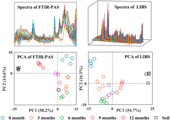 The differences between the original FTIR-PAS and LIBS spectra (Figure 5) were difficult to identify and analyze due to their similarities and overlapping portions. However, the PCA scatter plots evaluated the spectra explaining the differences among the films. Figure 6 shows the first and second principal components (PC1 and PC2, respectively) at the total wavenumber ranges of 500–4000 cm−1 in the FTIR-PAS spectra (72.8% total variance) and the total wavelength of 200–1000 nm in the LIBS spectra (71.0% total variance). Both PCA scatter plots of FTIR-PAS and LIBS spectra followed the same phenomenon: the longest distance in PC1 was between the 0-month films and soils. Additionally, the longer the PA films remained in the soil, the longer distance between 0-month samples and the shorter distance between the soil samples. This illustrated that, once the PA samples were buried in the soil, the two kinds of PA spectra would become more similar to the soil over time, due to the interaction between PA and the soil, as well as soil adhered to the surface of PA.
