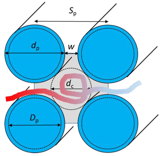 For the free energy of a semi-flexible chain in a narrow slit at strong confinement, Equation (6) divided by a factor of 2 was used since the free energy penalty of a chain in a square channel is, to a good approximation, twice that in a slit of the height equal to the channel size [18,19,21]. The representation of the strong confinement induced by a passage aperture using Equation (6) requires D to be replaced by w. In a similar vein, D has been replaced by dc for the representation of the moderate confinement induced by an interstitial channel-like volume, using Equation (7). This is only an approximation for what is actually not a perfect but leaky channel (Figure 1) and, thus, the size dc represents only the effective channel diameter. Also, the passage aperture can be approximated by the slit geometry only on short length scale near to the passage width w. Making equal these two expressions of the free energies one obtains the following condition for the confinement ratio at the transition of semi-flexible chain from a single to multiple occupancies of interstitial volumes in the post array:
