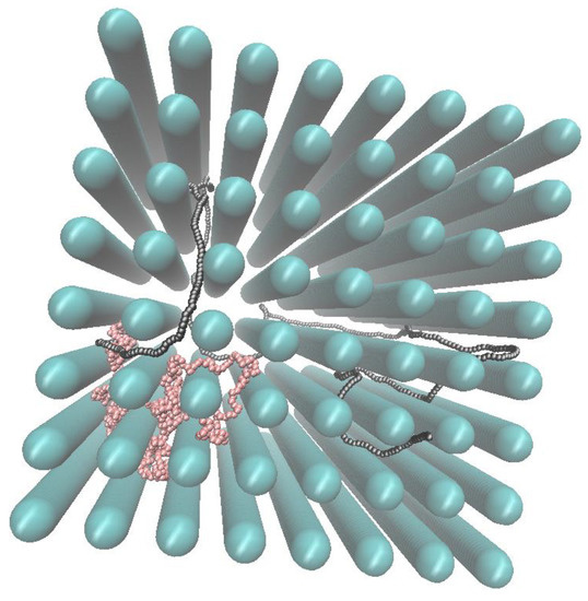 Snapshot of a diblock copolymer composed of the flexible and semi-flexible block in an array of nanoposts with the size dp = 6.9 and spacing Sp = 12. The pink and gray beads belong to the flexible and semi-flexible block, respectively.