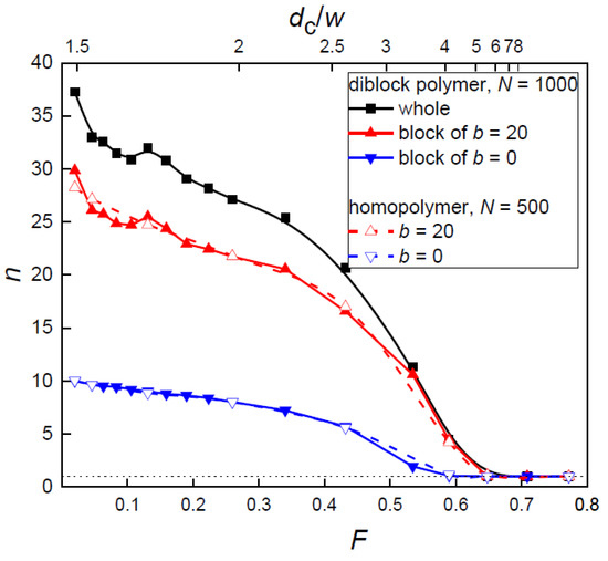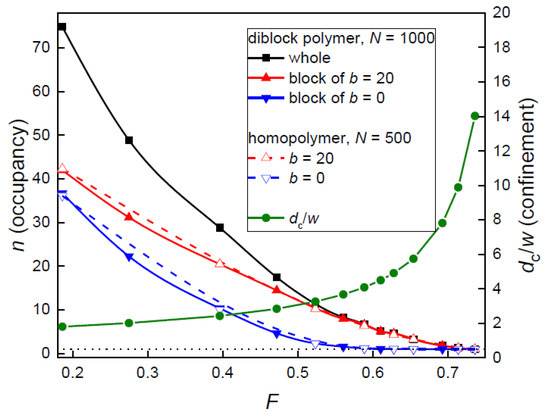 The second way of the geometry variation of the nanopost array was realized at the narrow passage width, w = 2. In Figure 6, the occupation number of the diblock copolymer and its individual blocks is shown along with the extent of confinement expressed by the ratio dc/w as functions of the filling fraction by nanoposts F.
