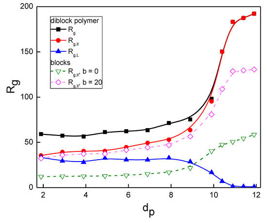 The radius of gyration Rg of the block copolymer in the nanopost array and its parallel and perpendicular components with respect to the nanopost axes, and , have also been estimated. These quantities provide an insight into the chain asymmetry induced by the nanopost array and in one property provide a picture that is related to the extension along posts Rs together with the lateral spreading n, the properties which were investigated separately above. While of the diblock chain increases with the increasing posts size dp (increasing nanopost crowding F) and tends to a plateau given by the maximum axial chain extension for the geometry of array, the perpendicular component substantially decreases in this region, as seen in Figure 5 for the same systems as in Figure 3 and Figure 4. In addition to the diblock copolymer, the parallel component is also shown for individual blocks. The additivity of for the two blocks in the overall is valid only for the narrowest interstitial volumes, similar to the situation with the span in Figure 4. In this region of strong confinement, the behavior of both blocks differs, however. While the semi-flexible block tends to plateau, approximately at dp = 10.9, the flexible block is still further extending on the increasing confinement strength. A comparison of the radius of gyration of the individual blocks with the respective homopolymer chains in the same nanopost array does not bring a difference, similarly to the span and occupation number (Figure 3 and Figure 4) and is not shown in Figure 5.