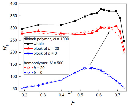 In contrast with the geometry variation at constant post separation, the span of the diblock copolymer along with the nanoposts at narrow constant passage width exhibits interesting maximum, Figure 7, similar to that already reported for homopolymer chains [12,13]. It appears as a result of two opposing tendencies. At high F, the diblock chain resides in a single interstitial volume that is sufficiently broad relatively to the passage width w. As F decreases also the width of interstitial volume dc decreases and thus the span increases. At the same time, the more restricted diblock chain starts to penetrate into more interstitial volumes and thus expands in the lateral direction which leads to the axial chain contraction. The diblock chain sequence within narrower individual interstitial volumes becomes more axially stretched. The maximum appears as an interplay of these effects. At high F values, the effect of the axial chain extension due to the narrowing of interstitial volumes prevails while at lower F values, the effect of the lateral chain expansion, when parts of the chain may follow opposite direction along the post axes, dominates. For the situation of single volume occupancy, at high F, the quasi-biaxial confinement approximation of interstitial volumes has been confirmed by investigation of Rs vs dc dependence. This dependence follows with x = 2/3 and 1 for the flexible and semi-flexible chain, respectively, in agreement with the exponent values predicted for the evolution of the chain axial expansion with the channel diameter [17]. When compared the semi-flexible block with its free analogue (N = 500) one can see the increased uncertainties under strong confinement (larger F). This is not surprising since the block is a part of a longer chain (N = 1000). In order to reach the same precision as for the shorter chains, these systems would need larger total simulation time to reach the same statistics as the shorter chains. However, this uncertainty does not exceed 10%.