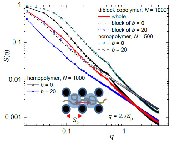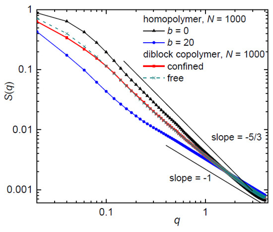 Since it has been shown that the behavior of a chain only weakly confined in the nanopost array is akin to the behavior of a free chain [13,14] the structure of the weakly confined diblock copolymer for narrow and well-separated posts, dp = 1.9, Sp = 12, is shown in Figure 8. The predicted relation S(q) ~ q−1/ν (ν is the scaling Flory exponent) gives rise to a dependence of different complexity dictated by the number of different length scales detectable in a chain. S(q) of the flexible homopolymer is characterized by the slopes −5/3 characterizing the organization of monomers with excluded volume effects and S(q) of the semi-flexible homopolymer displays the slope −1 characteristic for the rod-like arrangement of monomers at high q values corresponding to the persistence length. However, S(q) of the diblock copolymer is found between S(q) of the flexible and semi-flexible homopolymer. In consistence with the conformational behavior of the homopolymers [13,14], the diblock copolymer weakly confined in an array of very narrow posts with the separation much larger than the post diameter behaves like the corresponding free diblock copolymer.
