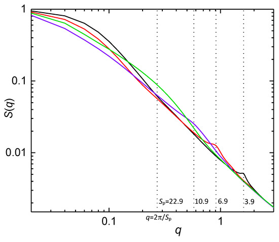 Structure factor for a flexible block of a block copolymer in an array of nanoposts with constant passage width w = 2 and variable Sp and dp. The vertical dashed lines indicate the increased segment correlations at the length scale Sp, the effective distance between the axes of two adjacent interstitial volumes.