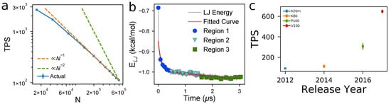 Figure 2a shows TPS decreases monotonically with N, closely matching the reference slope (orange). For the smallest systems (N = 16,500), this corresponds to being able to perform 400 ns per day, and, for the largest systems (N = 600,000), 17 ns per day. In Figure 2b, we show a characteristic time evolution of the Lennard–Jones pair potential energy, which we use as one proxy for structure. At equilibrium, measurements of potential energy are observed to fluctuate about a stable, time-invariant average (Region 3 in Figure 2b). Before equilibrium is reached, we observe a fast initial change in structure (Region 1), followed by a slower relaxation time (Region 2). We detail the automatic detection of these regions and present the curves for multiple systems in Supplementary Materials Section 5. Here, we observe Region 1 is insensitive to N, occurring within the first 0.5 μs of simulation time. The relaxation time (Region 2), however, strongly depends on N. We measure relaxation times of ∼0.2 μs for the ∼16,000 beads, ∼0.4 μs for ∼29,000 beads, and ∼1.0 μs for 40,000 beads. For system sizes larger than N = 40,000, we do not observe equilibration of the base case model 15mers at K, g/cm3, . Empirically, these observations suggest relaxation time scales , though the longer relaxation times for larger N tested here preclude detailed evaluation.