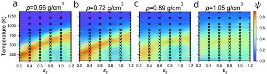 The degree of ordering, , for Protocol (1) shows the most robust assembly occurs at lower densities, with more temperature-solvent combinations resulting in high . (a) g/cm3; (b) g/cm3; (c) g/cm3; (d) g/cm3. Red regions denote order, whereas blue denotes disorder. Each black “x” indicates a measurement from an MD trajectory, and values between measurements are linearly interpolated.