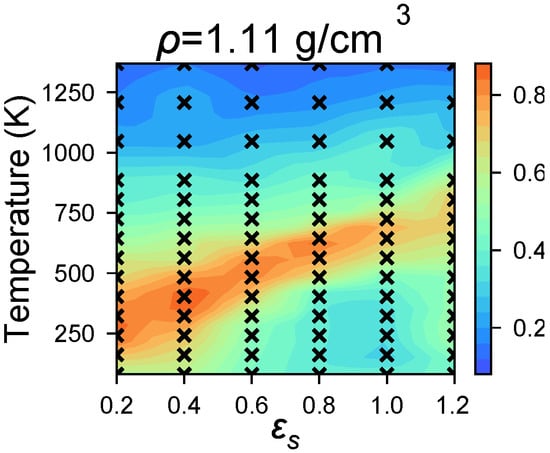 We consider a range of relevant film densities, g/cm3, with the largest g/cm3 corresponding to the experimental thin-film density for P3HT []. For the lowest densities, as much as 40% of the simulation volume is occupied by the implicit solvent, whereas the volume occupied by the implicit solvent is negligible for the highest densities. We employ an extremely simplified model of solvent quality: we define the parameter to represent how poor the solvent is for P3HT, and scale all of the pairwise interaction potentials by this amount (). We explore values from 0.2 to 1.2 in this work. Low values of correspond to solvents in which P3HT is highly soluble (e.g., chloroform, chlorobenzene or 1,2-dichlorobenzene), whereas larger values describe solvents where P3HT is less soluble (e.g., acetone) []. While this simplified model cannot capture complex or entropic solvent phenomena, it provides a significant computational advantage [,,]. Furthermore, adjusting while holding T constant enables exploration of how equilibrium structure depends on molecular attractions at fixed kinetic energy. In this work, we perform simulations at the combinations of T, , and described above to understand how these parameters in concert influence thermodynamic phase behavior.