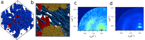 The large and small ordered systems shown in Figure 5a,b, in which only “large” clusters, identified using the cluster analysis discussed in Section 3.2, are shown (large clusters ≥ 6 monomers, and side chains are omitted). The large ordered system contains a few large crystallites, colored blue, red, and yellow. This contrasts with the small morphology, which primarily consists of a single large crystallite (shown in blue in Figure 5a), with the next largest having significantly fewer members (shown in red). These results indicate that smaller systems will tend to have fewer ordered crystallites, which limits the opportunity to observe periodic organization of these structures. Despite this difference, GIXS patterns show that the same periodic distances are present in both system sizes (Figure 5c vs. Figure 5d), albeit with significantly increased noise in the case of the smaller system. As such, small morphologies can be used to identify state-points of structural interest; however, large simulations are better at characterizing crystal structure and quantifying morphological order.