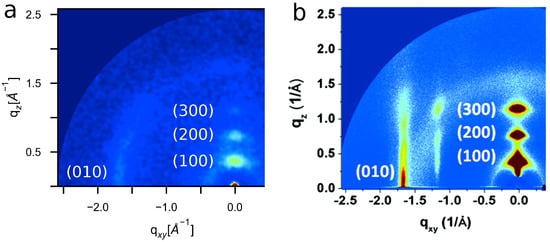 Our model produces (a) simulated GIXS patterns that closely match (b) experiment with -stacking features along the (010) plane at 1.68 ± 0.02 Å−1 and alkyl-stacking features along the (100) plane with a spacing of 0.38 ± 0.02 Å−1. (Experimental GIXS pattern (b) reprinted with permission from Ref. []. Copyright 2012 American Chemical Society).